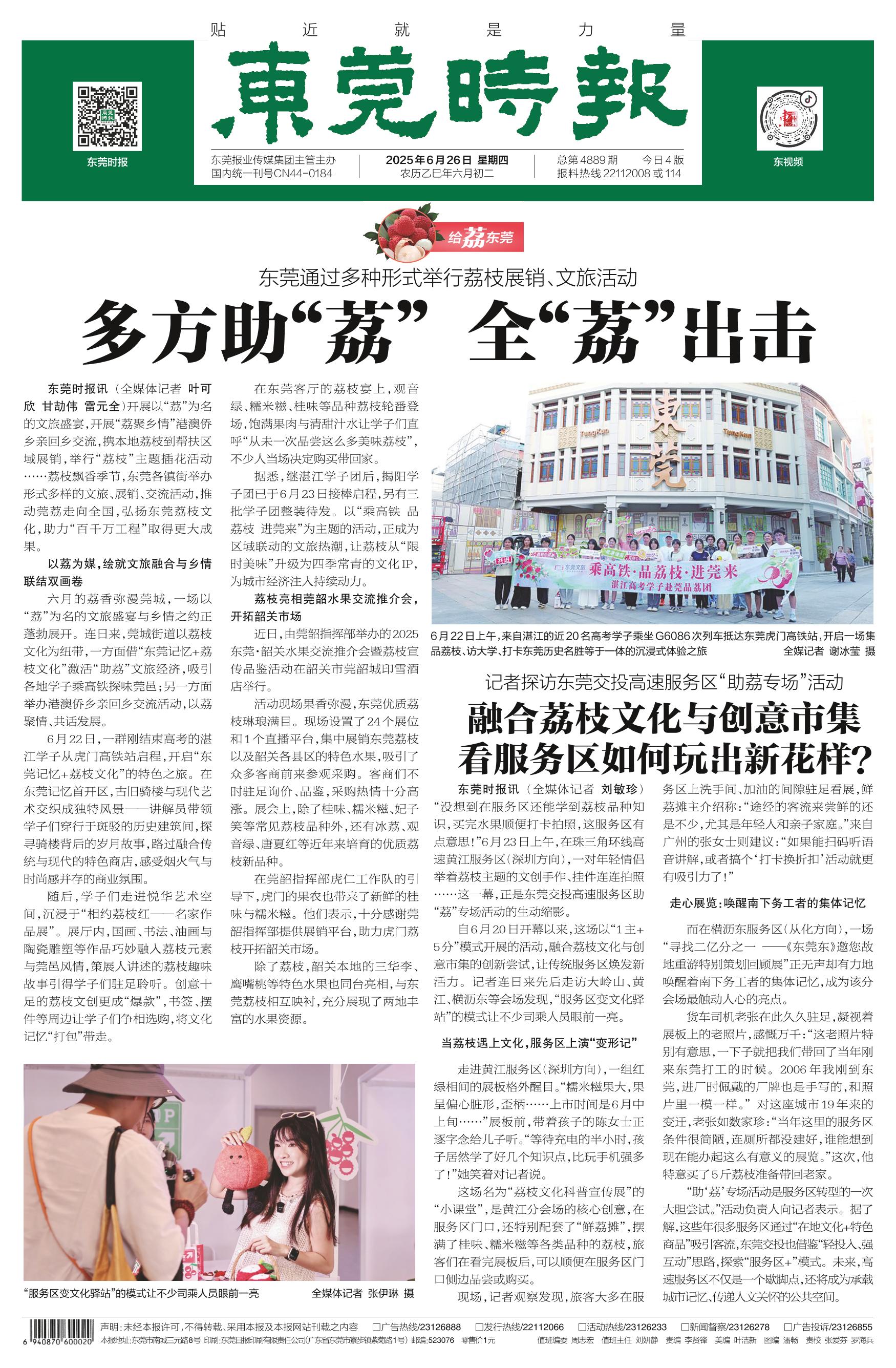 <div style='font-size: 16px!important;line-height: 28px!important;text-align: justify;color: #777!important;'>东莞通过多种形式举行荔枝展销、文旅活动</div><div style='font-size: 22px!important;line-height: 34px!important;text-align: justify!important;color: #000!important'>多方助“荔” 全“荔”出击</div><div style='font-size: 14px!important;line-height: 22px!important;text-align: left!important;color: #777!important;margin-top: 20px;'>东莞时报  叶可欣 甘劼伟 雷元全  2025-06-26</div><div><img id='paperImg' style='max-width: 100%;height: auto' src='//img.founderfx.cn/epaper/202507/08/3e1073ffe67a447796bc90d0d34e52ba/1.jpg' alt='' class='page-img'/></div><div style='font-size: 14px!important;line-height: 22px!important;text-align: center!important;color: #777!important;'><img src='//img.founderfx.cn/epaper/202507/08/3e1073ffe67a447796bc90d0d34e52ba/B01/19177407_sm1_1750858642353_s.jpg'style='display: block!important;margin: auto!important;max-width: 100%!important;'/> 6月22日上午,来自湛江的近20名高考学子乘坐G6086次列车抵达东莞虎门高铁站,开启一场集品荔枝、访大学、打卡东莞历史名胜等于一体的沉浸式体验之旅 全媒记者 谢冰莹 摄<img src='//img.founderfx.cn/epaper/202507/08/3e1073ffe67a447796bc90d0d34e52ba/B01/19175199_sm1_1750854441241_s.jpg'style='display: block!important;margin: auto!important;max-width: 100%!important;'/> “服务区变文化驿站”的模式让不少司乘人员眼前一亮全媒体记者 张伊琳 摄</div><p> 东莞时报讯 (全媒体记者 叶可欣 甘劼伟 雷元全)开展以“荔”为名的文旅盛宴,开展“荔聚乡情”港澳侨乡亲回乡交流,携本地荔枝到帮扶区域展销,举行“荔枝”主题插花活动……荔枝飘香季节,东莞各镇街举办形式多样的文旅、展销、交流活动,推动莞荔走向全国,弘扬东莞荔枝文化,助力“百千万工程”取得更大成果。</p><p> 以荔为媒,绘就文旅融合与乡情联结双画卷</p><p> 六月的荔香弥漫莞城,一场以“荔”为名的文旅盛宴与乡情之约正蓬勃展开。连日来,莞城街道以荔枝文化为纽带,一方面借“东莞记忆+荔枝文化”激活“助荔”文旅经济,吸引各地学子乘高铁探味莞邑;另一方面举办港澳侨乡亲回乡交流活动,以荔聚情、共话发展。</p><p> 6月22日,一群刚结束高考的湛江学子从虎门高铁站启程,开启“东莞记忆+荔枝文化”的特色之旅。在东莞记忆首开区,古旧骑楼与现代艺术交织成独特风景——讲解员带领学子们穿行于斑驳的历史建筑间,探寻骑楼背后的岁月故事,路过融合传统与现代的特色商店,感受烟火气与时尚感并存的商业氛围。</p><p> 随后,学子们走进悦华艺术空间,沉浸于“相约荔枝红——名家作品展”。展厅内,国画、书法、油画与陶瓷雕塑等作品巧妙融入荔枝元素与莞邑风情,策展人讲述的荔枝趣味故事引得学子们驻足聆听。创意十足的荔枝文创更成“爆款”,书签、摆件等周边让学子们争相选购,将文化记忆“打包”带走。</p><p> 在东莞客厅的荔枝宴上,观音绿、糯米糍、桂味等品种荔枝轮番登场,饱满果肉与清甜汁水让学子们直呼“从未一次品尝这么多美味荔枝”,不少人当场决定购买带回家。</p><p> 据悉,继湛江学子团后,揭阳学子团已于6月23日接棒启程,另有三批学子团整装待发。以“乘高铁 品荔枝 进莞来”为主题的活动,正成为区域联动的文旅热潮,让荔枝从“限时美味”升级为四季常青的文化IP,为城市经济注入持续动力。</p><p> 荔枝亮相莞韶水果交流推介会,开拓韶关市场</p><p> 近日,由莞韶指挥部举办的2025东莞·韶关水果交流推介会暨荔枝宣传品鉴活动在韶关市莞韶城印雪酒店举行。</p><p> 活动现场果香弥漫,东莞优质荔枝琳琅满目。现场设置了24个展位和1个直播平台,集中展销东莞荔枝以及韶关各县区的特色水果,吸引了众多客商前来参观采购。客商们不时驻足询价、品鉴,采购热情十分高涨。展会上,除了桂味、糯米糍、妃子笑等常见荔枝品种外,还有冰荔、观音绿、唐夏红等近年来培育的优质荔枝新品种。</p><p> 在莞韶指挥部虎仁工作队的引导下,虎门的果农也带来了新鲜的桂味与糯米糍。他们表示,十分感谢莞韶指挥部提供展销平台,助力虎门荔枝开拓韶关市场。</p><p> 除了荔枝,韶关本地的三华李、鹰嘴桃等特色水果也同台亮相,与东莞荔枝相互映衬,充分展现了两地丰富的水果资源。</p>