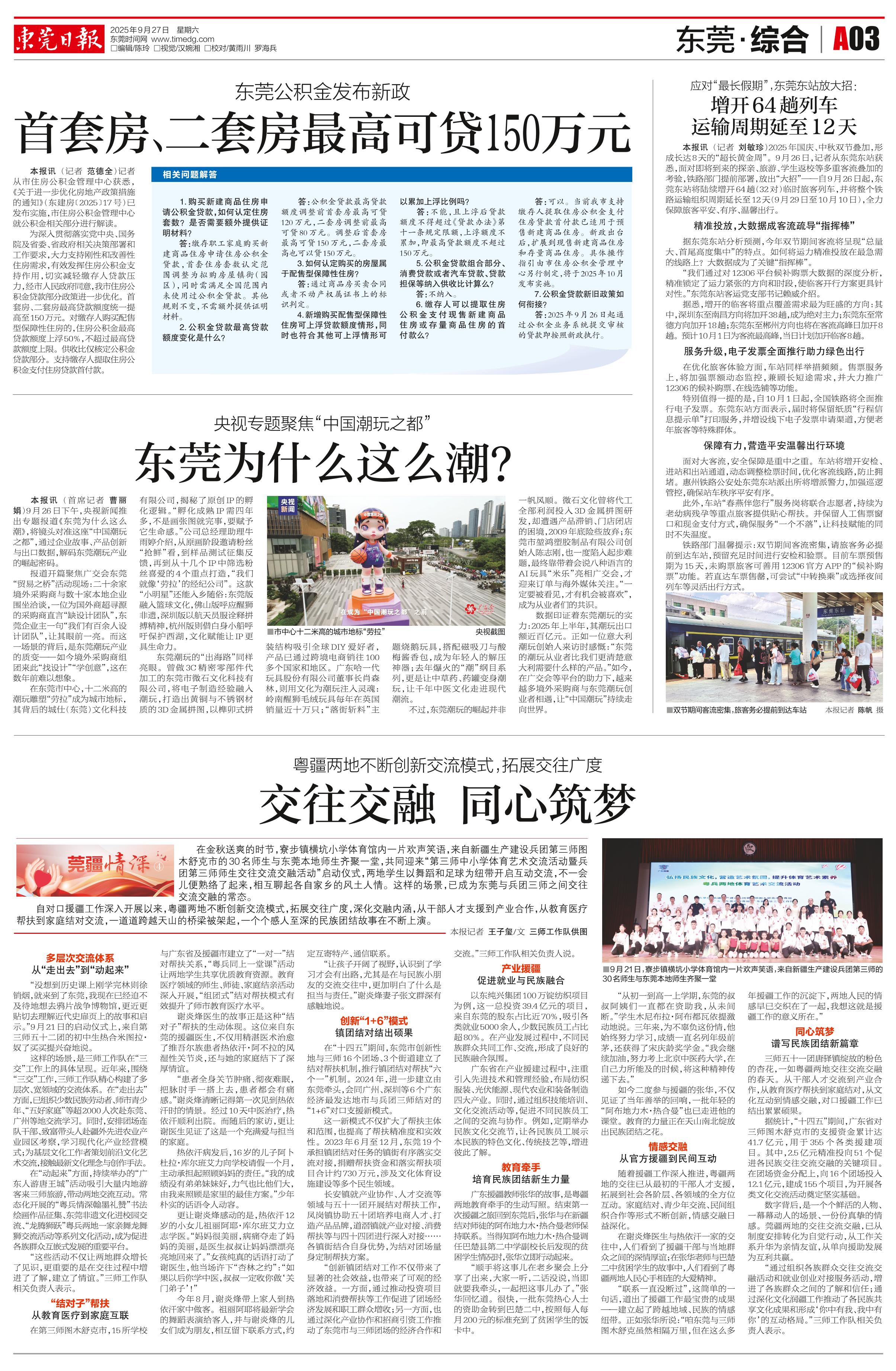 <div style='font-size: 16px!important;line-height: 28px!important;text-align: justify;color: #777!important;'>东莞公积金发布新政</div><div style='font-size: 22px!important;line-height: 34px!important;text-align: justify!important;color: #000!important'>首套房、二套房最高可贷150万元</div><div style='font-size: 14px!important;line-height: 22px!important;text-align: left!important;color: #777!important;margin-top: 20px;'>东莞日报  记者 范德全  2025-09-27</div><div><img id='paperImg' style='max-width: 100%;height: auto' src='//img.founderfx.cn/epaper/202509/27/009de6539ecf4e2096bfa04094ddf886/3.jpg' alt='' class='page-img'/></div><p> 本报讯 记者从市住房公积金管理中心获悉,《关于进一步优化房地产政策措施的通知》(东建房﹝2025﹞17号)已发布实施,市住房公积金管理中心就公积金相关部分进行解读。</p><p> 为深入贯彻落实党中央、国务院及省委、省政府相关决策部署和工作要求,大力支持刚性和改善性住房需求,有效发挥住房公积金支持作用,切实减轻缴存人贷款压力,经市人民政府同意,我市住房公积金贷款部分政策进一步优化。首套房、二套房最高贷款额度统一提高至150万元。对缴存人购买配售型保障性住房的,住房公积金最高贷款额度上浮50%,不超过最高贷款额度上限。供收比仅核定公积金贷款部分。支持缴存人提取住房公积金支付住房贷款首付款。</p><p> 相关问题解答</p><p> 1.购买新建商品住房申请公积金贷款,如何认定住房套数?是否需要额外提供证明材料?</p><p> 答:缴存职工家庭购买新建商品住房申请住房公积金贷款,首套住房套数认定范围调整为拟购房屋镇街(园区),同时需满足全国范围内未使用过公积金贷款。其他规则不变,不需额外提供证明材料。</p><p> 2.公积金贷款最高贷款额度变化是什么?</p><p> 答:公积金贷款最高贷款额度调整前首套房最高可贷120万元,二套房调整前最高可贷80万元。调整后首套房最高可贷150万元,二套房最高也可以贷150万元。</p><p> 3.如何认定购买的房屋属于配售型保障性住房?</p><p> 答:通过商品房买卖合同或者不动产权属证书上的标识判定。</p><p> 4.新增购买配售型保障性住房可上浮贷款额度情形,同时也符合其他可上浮情形可以累加上浮比例吗?</p><p> 答:不能,且上浮后贷款额度不得超过《贷款办法》第十一条规定限额,上浮额度不累加,即最高贷款额度不超过150万元。</p><p> 5.公积金贷款组合部分、消费贷款或者汽车贷款、贷款担保等纳入供收比计算么?</p><p> 答:不纳入。</p><p> 6.缴存人可以提取住房公积金支付现售新建商品住房或存量商品住房的首付款么?</p><p> 答:可以。当前我市支持缴存人提取住房公积金支付住房贷款首付款已适用于预售新建商品住房。新政出台后,扩展到现售新建商品住房和存量商品住房。具体操作指引由市住房公积金管理中心另行制定,将于2025年10月发布实施。</p><p> 7.公积金贷款新旧政策如何衔接?</p><p> 答:2025年9月26日起通过公积金业务系统提交审核的贷款即按照新政执行。</p>