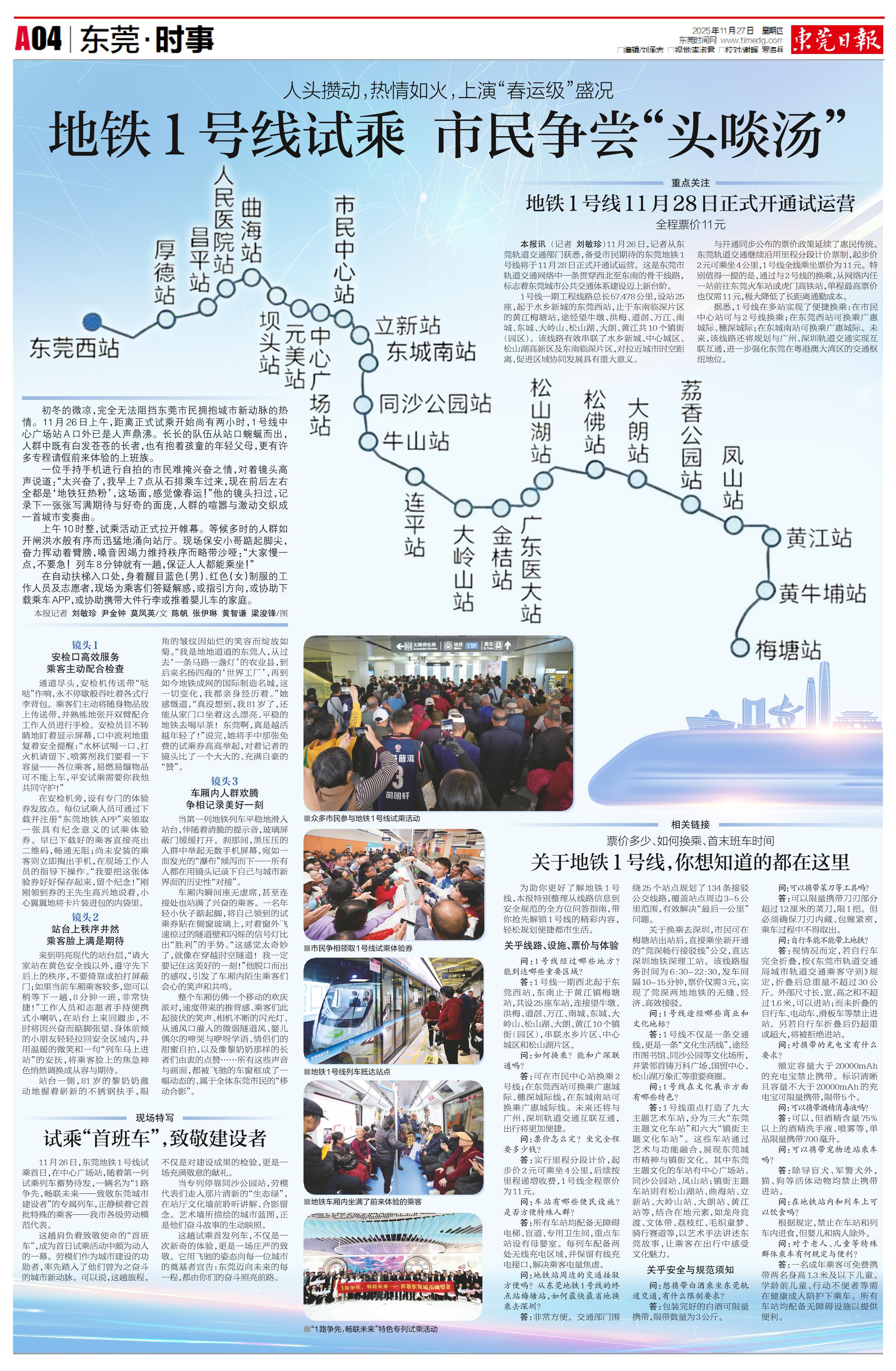<div style='font-size: 16px!important;line-height: 28px!important;text-align: justify;color: #777!important;'>人头攒动,热情如火,上演“春运级”盛况</div><div style='font-size: 22px!important;line-height: 34px!important;text-align: justify!important;color: #000!important'>地铁1号线试乘 市民争尝“头啖汤”</div><div style='font-size: 14px!important;line-height: 22px!important;text-align: left!important;color: #777!important;margin-top: 20px;'>东莞日报  本报记者 刘敏珍 尹金钟 莫凤英/文 陈帆 张伊琳 黄智谦 梁浚锋/图  2025-11-27</div><div><img id='paperImg' style='max-width: 100%;height: auto' src='//img.founderfx.cn/epaper/202511/27/e204f746d97b4236a36b24a5000e6f68/4.jpg' alt='' class='page-img'/></div><div style='font-size: 14px!important;line-height: 22px!important;text-align: center!important;color: #777!important;'><img src='//img.founderfx.cn/epaper/202511/27/e204f746d97b4236a36b24a5000e6f68/A04/20805643_sm1_1764165311223_s.jpg'style='display: block!important;margin: auto!important;max-width: 100%!important;'/> ■众多市民参与地铁1号线试乘活动<img src='//img.founderfx.cn/epaper/202511/27/e204f746d97b4236a36b24a5000e6f68/A04/20805227_sm1_1764164702670_s.jpg'style='display: block!important;margin: auto!important;max-width: 100%!important;'/> ■市民争相领取1号线试乘体验券<img src='//img.founderfx.cn/epaper/202511/27/e204f746d97b4236a36b24a5000e6f68/A04/20805493_sm1_1764165350162_s.jpg'style='display: block!important;margin: auto!important;max-width: 100%!important;'/> ■地铁1号线列车抵达站点<img src='//img.founderfx.cn/epaper/202511/27/e204f746d97b4236a36b24a5000e6f68/A04/20805213_sm1_1764164805896_s.jpg'style='display: block!important;margin: auto!important;max-width: 100%!important;'/> ■地铁车厢内坐满了前来体验的乘客<img src='//img.founderfx.cn/epaper/202511/27/e204f746d97b4236a36b24a5000e6f68/A04/20804389_sm1_1764171379855_s.jpg'style='display: block!important;margin: auto!important;max-width: 100%!important;'/> ■“1路争先,畅联未来”特色专列试乘活动</div><p> </p><p> </p><p> 初冬的微凉,完全无法阻挡东莞市民拥抱城市新动脉的热情。11月26日上午,距离正式试乘开始尚有两小时,1号线中心广场站A口外已是人声鼎沸。长长的队伍从站口蜿蜒而出,人群中既有白发苍苍的长者,也有抱着孩童的年轻父母,更有许多专程请假前来体验的上班族。</p><p> 一位手持手机进行自拍的市民难掩兴奋之情,对着镜头高声说道:“太兴奋了,我早上7点从石排乘车过来,现在前后左右全都是‘地铁狂热粉’,这场面,感觉像春运!”他的镜头扫过,记录下一张张写满期待与好奇的面庞,人群的喧嚣与激动交织成一首城市变奏曲。</p><p> 上午10时整,试乘活动正式拉开帷幕。等候多时的人群如开闸洪水般有序而迅猛地涌向站厅。现场保安小哥踮起脚尖,奋力挥动着臂膀,嗓音因竭力维持秩序而略带沙哑:“大家慢一点,不要急!列车8分钟就有一趟,保证人人都能乘坐!”</p><p> 在自动扶梯入口处,身着醒目蓝色(男)、红色(女)制服的工作人员及志愿者,现场为乘客们答疑解惑,或指引方向,或协助下载乘车APP,或协助携带大件行李或推着婴儿车的家庭。</p><p> </p><p> </p><p> </p><p> 镜头1</p><p> 安检口高效服务</p><p> 乘客主动配合检查</p><p> 通道尽头,安检机传送带“哒哒”作响,永不停歇般吞吐着各式行李背包。乘客们主动将随身物品放上传送带,并熟练地张开双臂配合工作人员进行手检。安检员目不转睛地盯着显示屏幕,口中流利地重复着安全提醒:“水杯试喝一口、打火机请留下、喷雾剂我们要看一下容量——各位乘客,易燃易爆物品可不能上车,平安试乘需要你我他共同守护!”</p><p> 在安检机旁,设有专门的体验券发放点。每位试乘人员可通过下载并注册“东莞地铁APP”来领取一张具有纪念意义的试乘体验券。早已下载好的乘客直接亮出二维码,畅通无阻;尚未安装的乘客则立即掏出手机,在现场工作人员的指导下操作。“我要把这张体验券好好保存起来,留个纪念!”刚刚领到券的王先生高兴地说着,小心翼翼地将卡片装进包的内袋里。</p><p> </p><p> </p><p> 镜头2</p><p> 站台上秩序井然</p><p> 乘客脸上满是期待</p><p> 来到明亮现代的站台层,“请大家站在黄色安全线以外,遵守先下后上的秩序,不要倚靠或拍打屏蔽门;如果当前车厢乘客较多,您可以稍等下一趟,8分钟一班,非常快捷!”工作人员和志愿者手持便携式小喇叭,在站台上来回踱步,不时将因兴奋而踮脚张望、身体前倾的小朋友轻轻拉回安全区域内,并用温暖的微笑和一句“列车马上进站”的安抚,将乘客脸上的焦急神色悄然调换成从容与期待。</p><p> 站台一侧,81岁的黎奶奶激动地握着崭新的不锈钢扶手,眼角的皱纹因灿烂的笑容而绽放如菊。“我是地地道道的东莞人,从过去‘一条马路一盏灯’的农业县,到后来名扬四海的‘世界工厂’,再到如今地铁成网的国际制造名城,这一切变化,我都亲身经历着。”她感慨道,“真没想到,我81岁了,还能从家门口坐着这么漂亮、平稳的地铁去喝早茶!东莞啊,真是越活越年轻了!”说完,她将手中那张免费的试乘券高高举起,对着记者的镜头比了一个大大的、充满自豪的“赞”。</p><p> </p><p> </p><p> 镜头3</p><p> 车厢内人群欢腾</p><p> 争相记录美好一刻</p><p> 当第一列地铁列车平稳地滑入站台,伴随着清脆的提示音,玻璃屏蔽门缓缓打开。刹那间,黑压压的人群中举起无数手机屏幕,宛如一面发光的“瀑布”倾泻而下——所有人都在用镜头记录下自己与城市新界