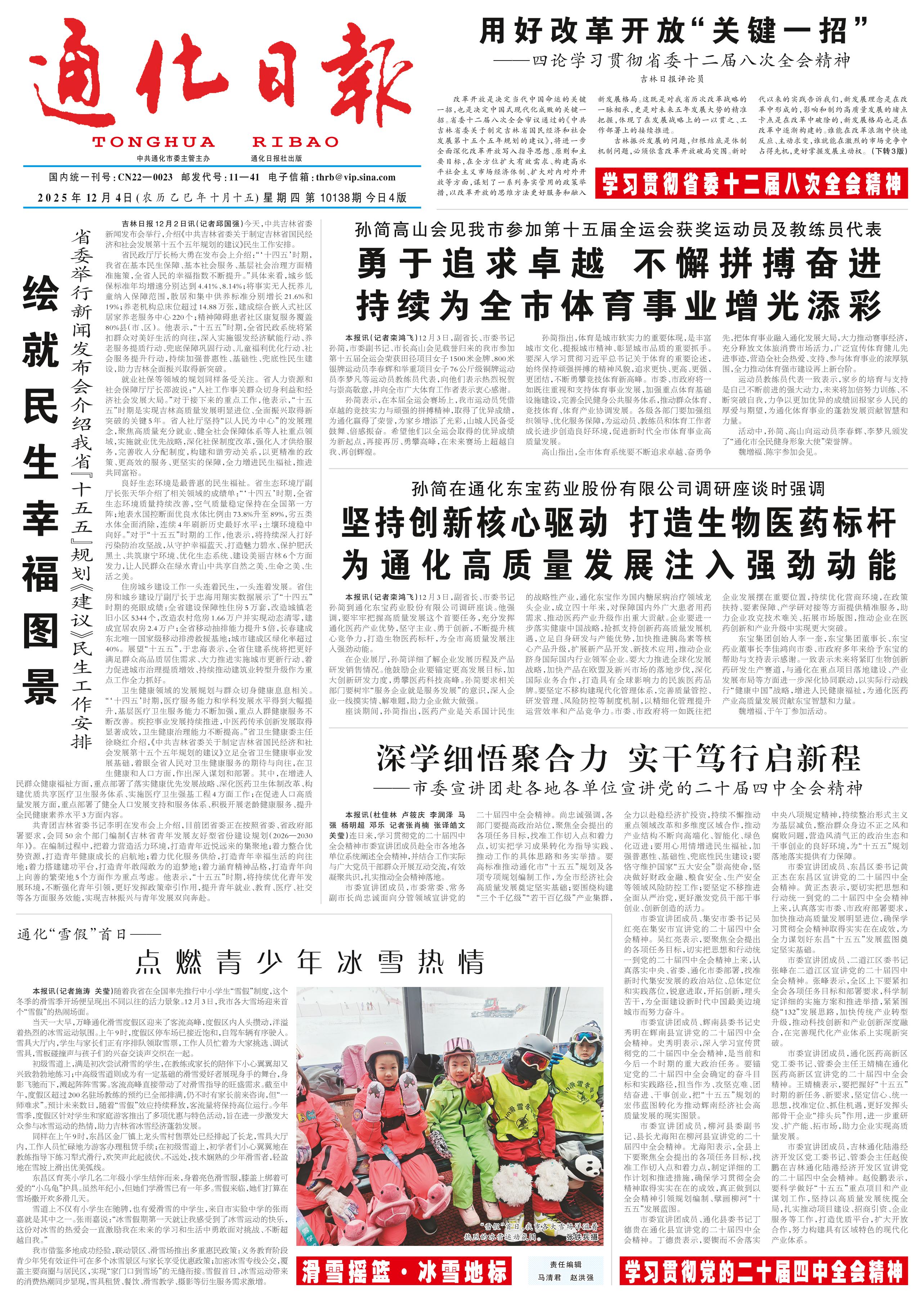 <div style='font-size: 22px!important;line-height: 34px!important;text-align: justify!important;color: #000!important'>绘就民生幸福图景</div><div style='font-size: 16px!important;line-height: 28px!important;text-align: justify;color: #777!important;margin-top: 20px;'>省委举行新闻发布会介绍我省“十五五”规划《建议》民生工作安排</div><div style='font-size: 14px!important;line-height: 22px!important;text-align: left!important;color: #777!important;margin-top: 20px;'>通化日报  2025-12-04</div><div><img id='paperImg' style='max-width: 100%;height: auto' src='//img.founderfx.cn/epaper/202512/04/93b49b8b0c3640b591cd517185f68691/1.jpg' alt='' class='page-img'/></div><p>吉林日报12月2日讯(记者邱国强)今天,中共吉林省委新闻发布会举行,介绍《中共吉林省委关于制定吉林省国民经济和社会发展第十五个五年规划的建议》民生工作安排。</p><p>省民政厅厅长杨大勇在发布会上介绍:“‘十四五’时期,我省在基本民生保障、基本社会服务、基层社会治理方面精准施策,全省人民的幸福指数不断提升。”具体来看,城乡低保标准年均增速分别达到4.41%、8.14%;将事实无人抚养儿童纳入保障范围,散居和集中供养标准分别增长21.6%和19%;养老机构总床位超过14.88万张,建成综合嵌入式社区居家养老服务中心220个;精神障碍患者社区康复服务覆盖80%县(市、区)。他表示,“十五五”时期,全省民政系统将紧扣群众对美好生活的向往,深入实施银发经济赋能行动、养老服务提质行动、兜底保障巩固行动、儿童福利优化行动、社会服务提升行动,持续加强普惠性、基础性、兜底性民生建设,助力吉林全面振兴取得新突破。</p><p>就业社保等领域的规划同样备受关注。省人力资源和社会保障厅厅长邵波说:“人社工作事关群众切身利益和经济社会发展大局。”对于接下来的重点工作,他表示,“十五五”时期是实现吉林高质量发展明显进位、全面振兴取得新突破的关键5年。省人社厅坚持“以人民为中心”的发展理念,聚焦高质量充分就业、健全社会保障体系等人社重点领域,实施就业优先战略,深化社保制度改革,强化人才供给服务,完善收入分配制度,构建和谐劳动关系,以更精准的政策、更高效的服务、更坚实的保障,全力增进民生福祉,推进共同富裕。</p><p>良好生态环境是最普惠的民生福祉。省生态环境厅副厅长张天华介绍了相关领域的成绩单:“‘十四五’时期,全省生态环境质量持续改善,空气质量稳定保持在全国第一方阵;地表水国控断面优良水体比例由73.8%升至89%,劣五类水体全面消除,连续4年刷新历史最好水平;土壤环境稳中向好。”对于“十五五”时期的工作,他表示,将持续深入打好污染防治攻坚战,从守护幸福蓝天、打造魅力碧水、保护肥沃黑土、共筑康宁环境、优化生态系统、建设美丽吉林6个方面发力,让人民群众在绿水青山中共享自然之美、生命之美、生活之美。</p><p>住房城乡建设工作一头连着民生,一头连着发展。省住房和城乡建设厅副厅长于忠海用翔实数据展示了“十四五”时期的亮眼成绩:全省建设保障性住房5万套,改造城镇老旧小区5344个,改造农村危房1.66万户并实现动态清零,建成宜居农房2.4万户;全省移动抽排能力提升5倍,长春建成东北唯一国家级移动排涝救援基地;城市建成区绿化率超过40%。展望“十五五”,于忠海表示,全省住建系统将把更好满足群众高品质居住需求、大力推进实施城市更新行动、着力促进城市治理提质增效、持续推动建筑业转型升级作为重点工作全力抓好。</p><p>卫生健康领域的发展规划与群众切身健康息息相关。“‘十四五’时期,医疗服务能力和学科发展水平得到大幅提升,基层医疗卫生服务能力不断加强,重点人群健康服务不断改善。疾控事业发展持续推进,中医药传承创新发展取得显著成效,卫生健康治理能力不断提高。”省卫生健康委主任徐晓红介绍,《中共吉林省委关于制定吉林省国民经济和社会发展第十五个五年规划的建议》立足全省卫生健康事业发展基础,着眼全省人民对卫生健康服务的期待与向往,在卫生健康和人口方面,作出深入谋划和部署。其中,在增进人民群众健康福祉方面,重点部署了落实健康优先发展战略、深化医药卫生体制改革、构建优质共享医疗卫生服务体系、实施医疗卫生强基工程4方面工作;在促进人口高质量发展方面,重点部署了健全人口发展支持和服务体系、积极开展老龄健康服务、提升全民健康素养水平3方面内容。</p><p>共青团吉林省委书记李明在发布会上介绍,目前团省委正在按照省委、省政府部署要求,会同50余个部门编制《吉林省青年发展友好型省份建设规划(2026—2030年)》。在编制过程中,把着力营造活力环境,打造青年近悦远来的集聚地;着力整合优势资源,打造青年健康成长的启航地;着力优化服务供给,打造青年幸福生活的向往地;着力搭建建功平台,打造青年敢闯敢为的追梦地;着力涵育精神品格,打造青年向上向善的繁荣地5个方面作为重点考虑。他表示,“十五五”时期,将持续优化青年发展环境,不断强化青年引领,更好发挥政策牵引作用,提升青年就业、教育、医疗、社交等各方面服务效能,实现吉林振兴与青年发展双向奔赴。</p>