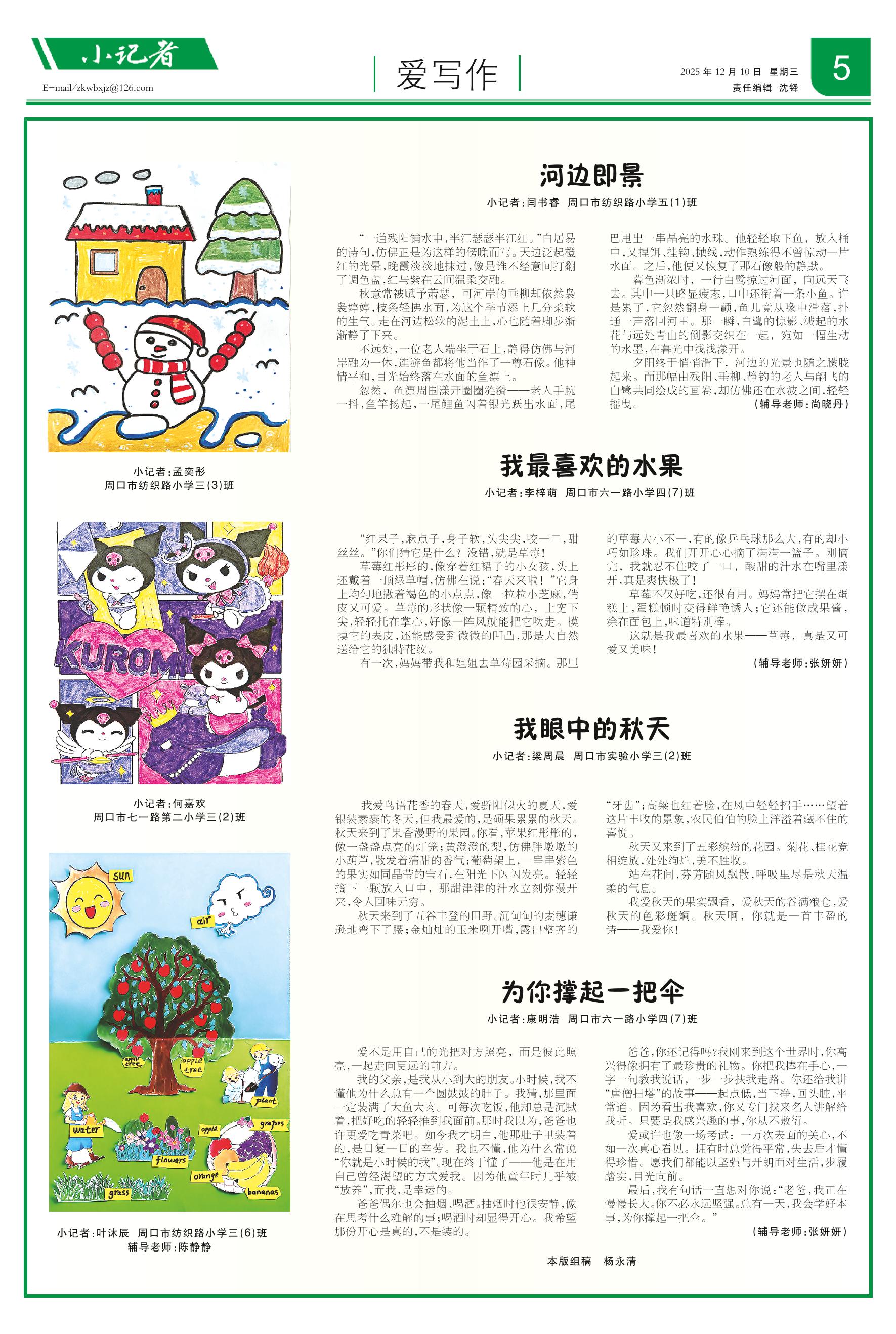 <div style='font-size: 22px!important;line-height: 34px!important;text-align: justify!important;color: #000!important'>我最喜欢的水果</div><div style='font-size: 14px!important;line-height: 22px!important;text-align: left!important;color: #777!important;margin-top: 20px;'>周口晚报  2025-12-10</div><div><img id='paperImg' style='max-width: 100%;height: auto' src='//img.founderfx.cn/epaper/202512/09/51f6d61b959e480ca30e5f1697a4498b/5.jpg' alt='' class='page-img'/></div><p> 小记者:李梓萌 周口市六一路小学四(7)班</p><p> “红果子,麻点子,身子软,头尖尖,咬一口,甜丝丝。”你们猜它是什么?没错,就是草莓!</p><p> 草莓红彤彤的,像穿着红裙子的小女孩,头上还戴着一顶绿草帽,仿佛在说:“春天来啦!”它身上均匀地撒着褐色的小点点,像一粒粒小芝麻,俏皮又可爱。草莓的形状像一颗精致的心,上宽下尖,轻轻托在掌心,好像一阵风就能把它吹走。摸摸它的表皮,还能感受到微微的凹凸,那是大自然送给它的独特花纹。</p><p> 有一次,妈妈带我和姐姐去草莓园采摘。那里的草莓大小不一,有的像乒乓球那么大,有的却小巧如珍珠。我们开开心心摘了满满一篮子。刚摘完,我就忍不住咬了一口,酸甜的汁水在嘴里漾开,真是爽快极了!</p><p> 草莓不仅好吃,还很有用。妈妈常把它摆在蛋糕上,蛋糕顿时变得鲜艳诱人;它还能做成果酱,涂在面包上,味道特别棒。</p><p> 这就是我最喜欢的水果——草莓,真是又可爱又美味!</p><p> (辅导老师:张妍妍)</p>